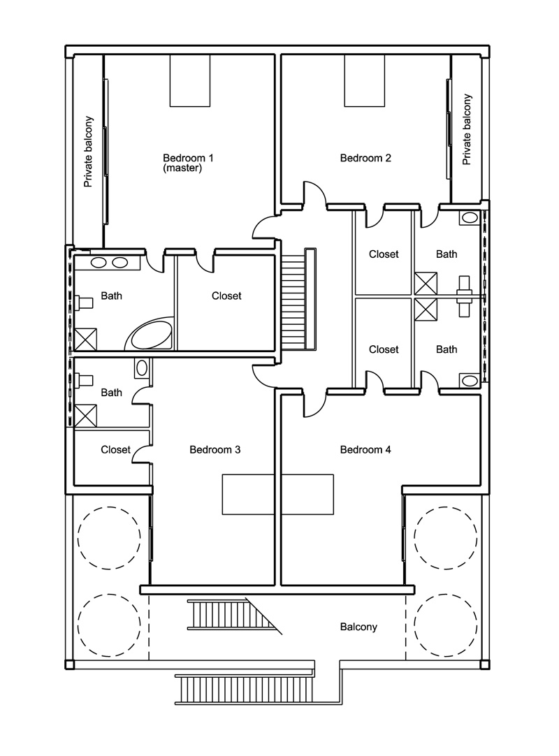 Luxury four bed / bath home in early modernist style. Features a double attached garage, dramatic cantilever façades, with private balconies and a fully accessible roof terrace with external staircases. All floor to ceiling glazing is recessed or shaded, making this design ideally suited for hot sunny climates. Shell construction in reinforced concrete.